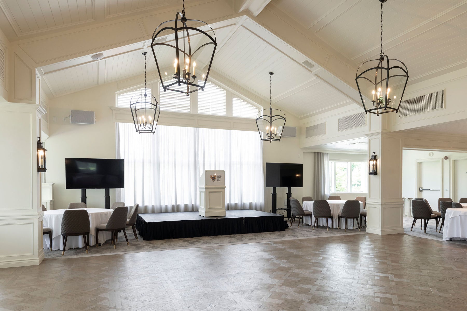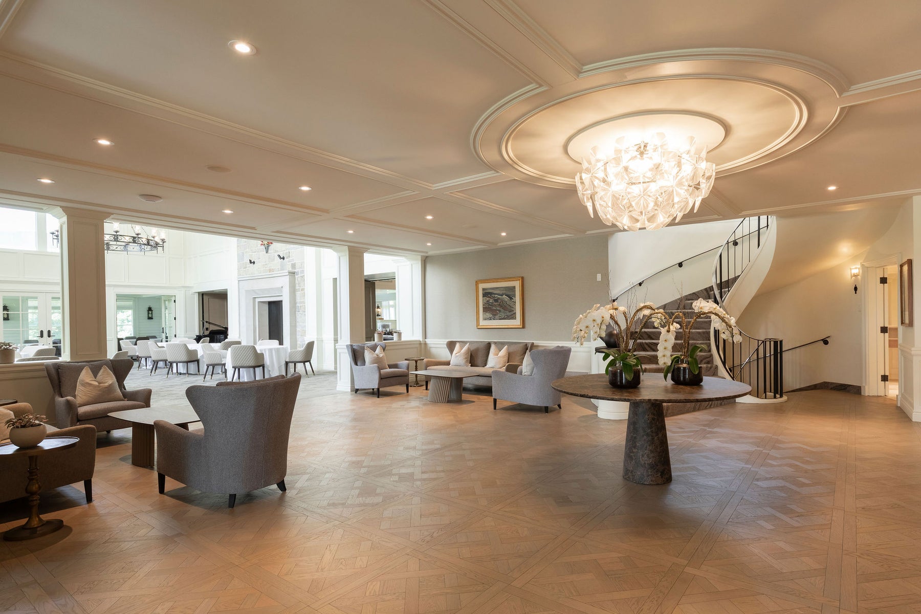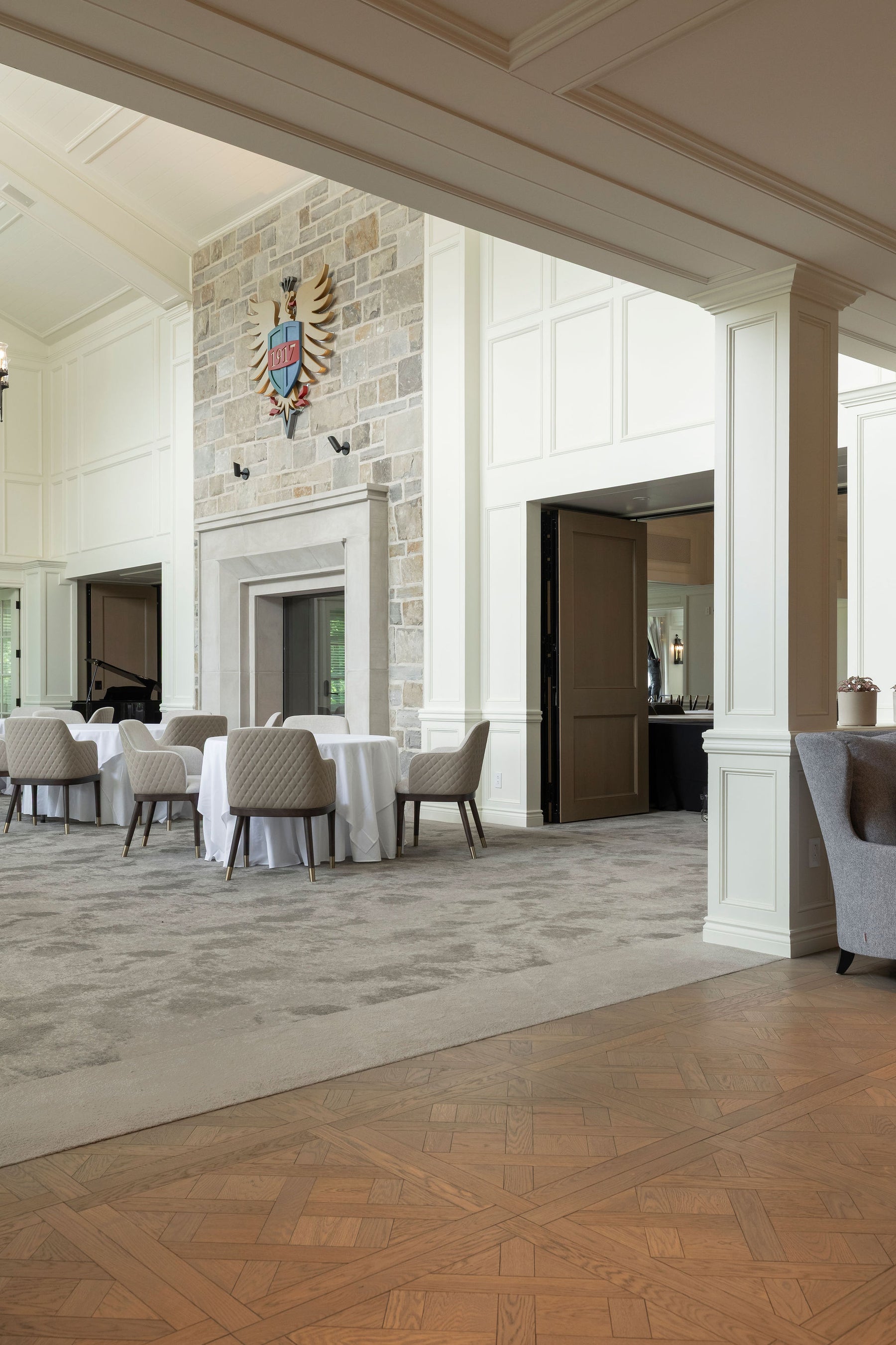 Dans le cadre de la rénovation et de l’agrandissement du chalet du Club de golf Laval-sur-le-Lac, un soin particulier a été porté aux détails architecturaux et à l’atmosphère intérieure. Le choix du plancher est rapidement devenu central : un parquet de Versailles, symbole d’élégance intemporelle et d’héritage classique.