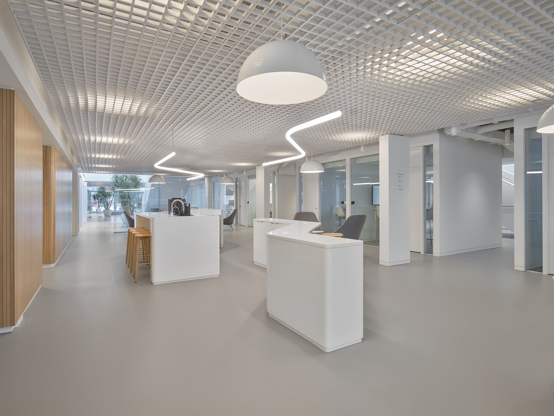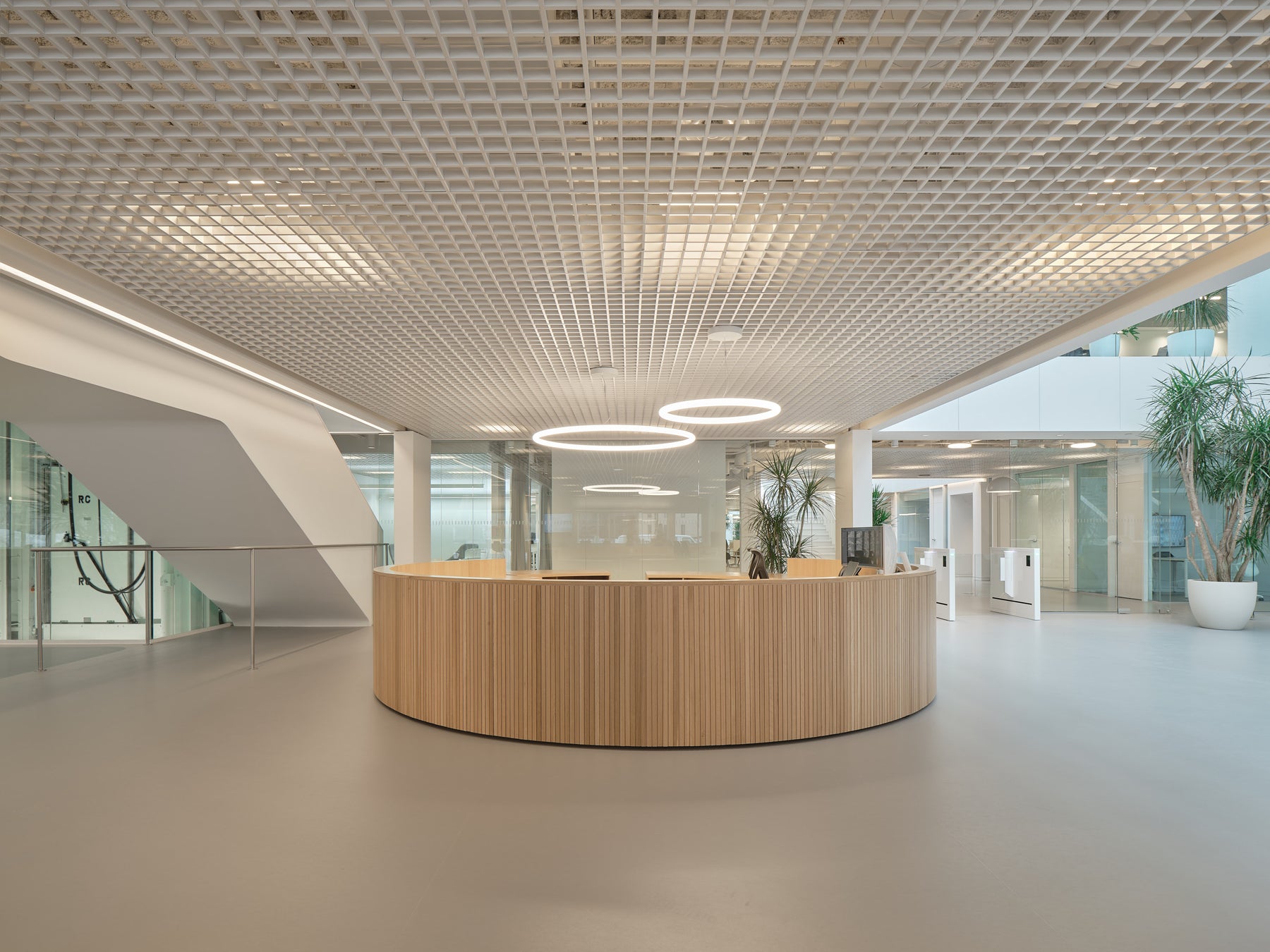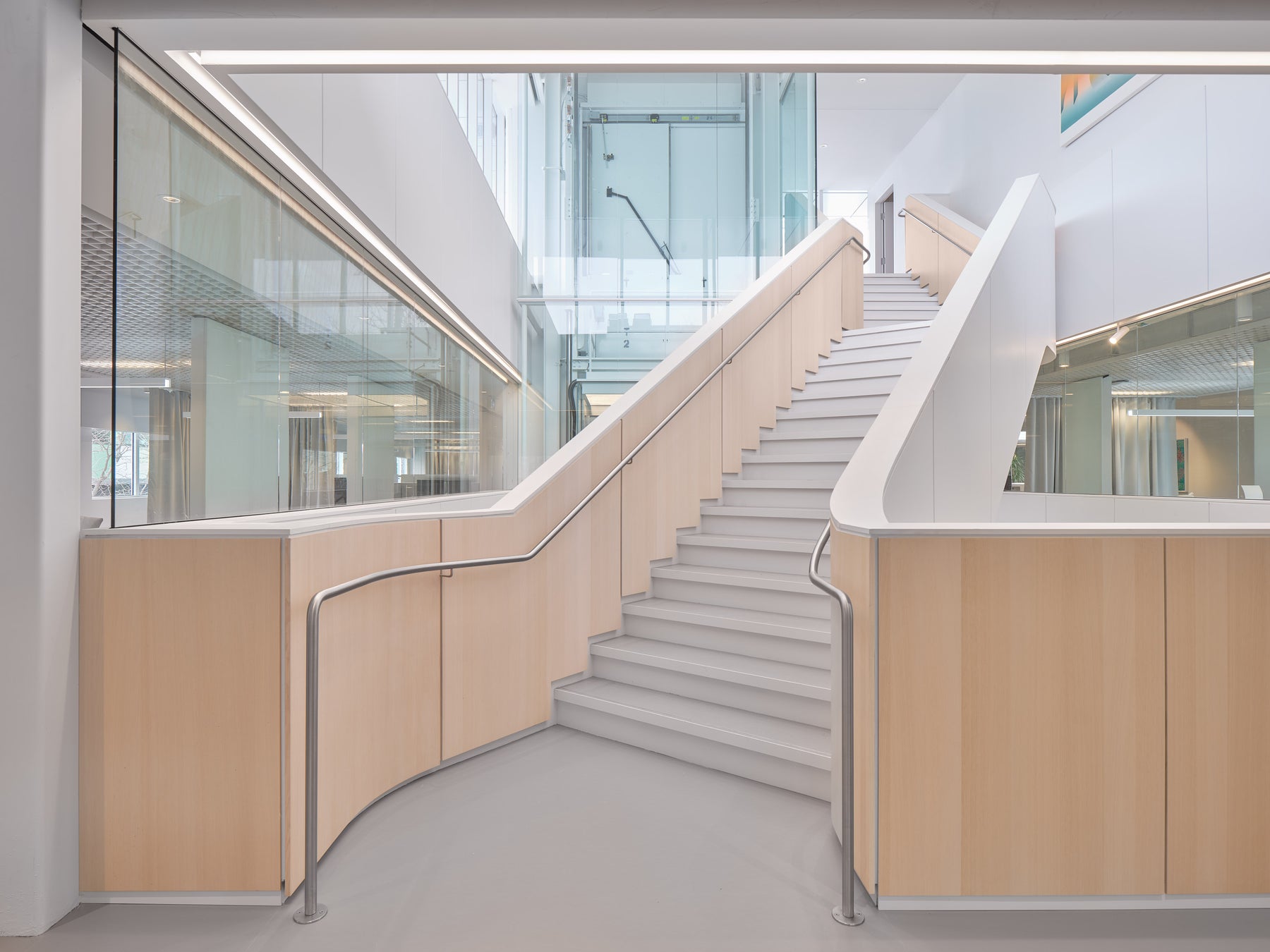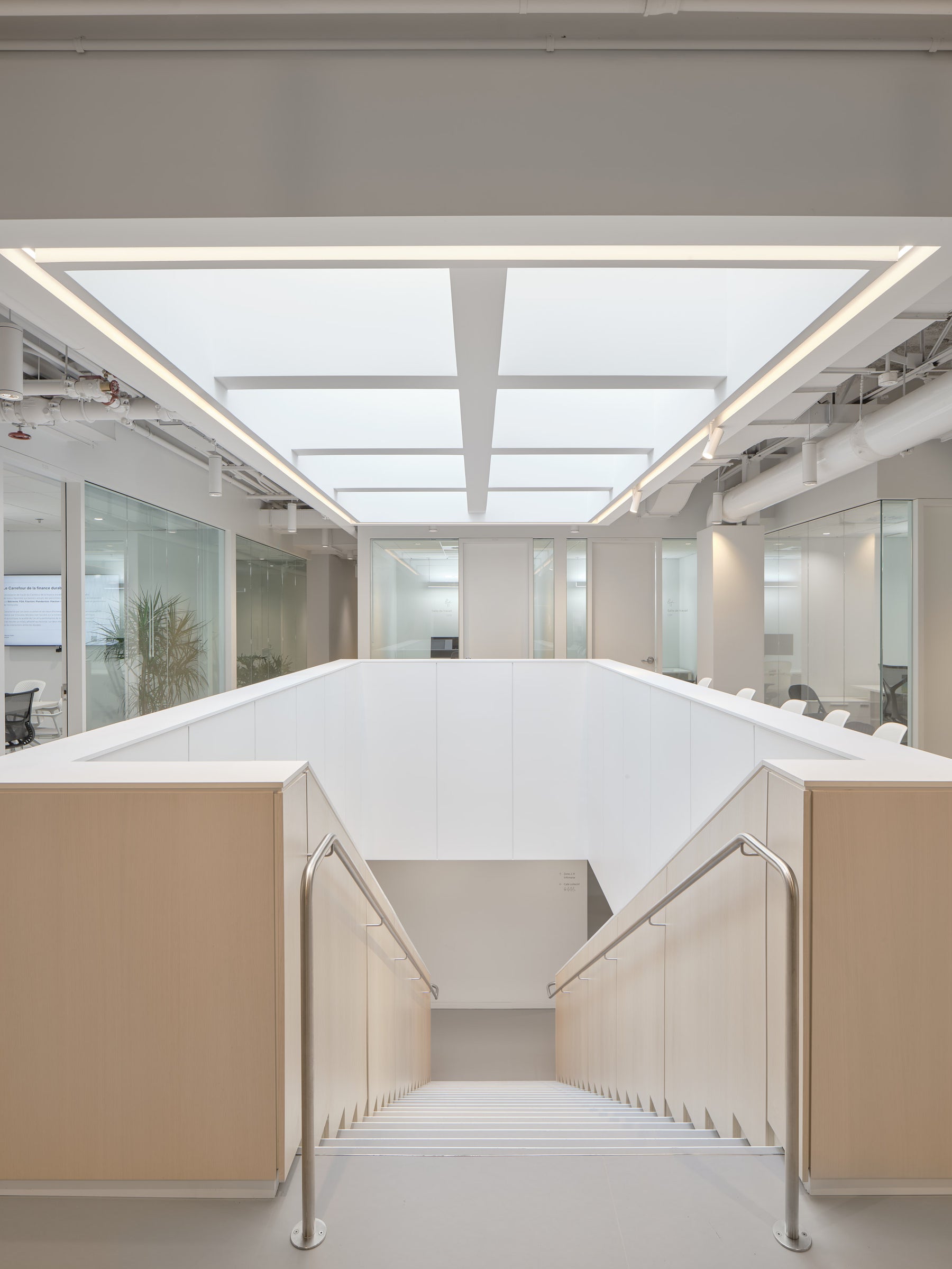 Ce revêtement, encore peu exploité en milieu de bureau, a permis de créer des surfaces claires, chaleureuses et continues. L’installation a demandé une maîtrise technique exceptionnelle : joints soudés sur toute la superficie, marches en marmoléum et en caoutchouc, précision millimétrée à chaque étape. Une intervention signée par une équipe experte, habituée aux défis de finition haut de gamme.