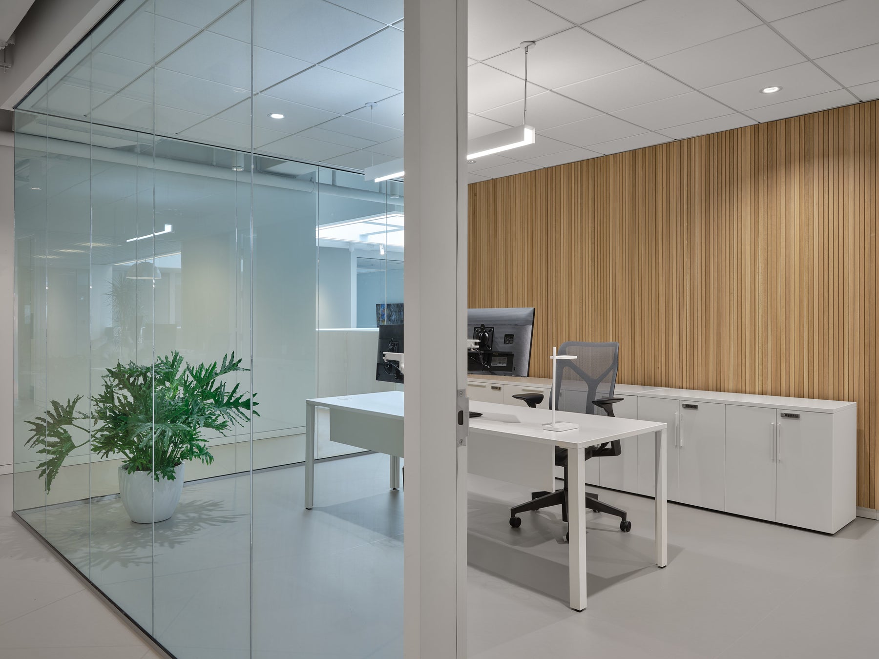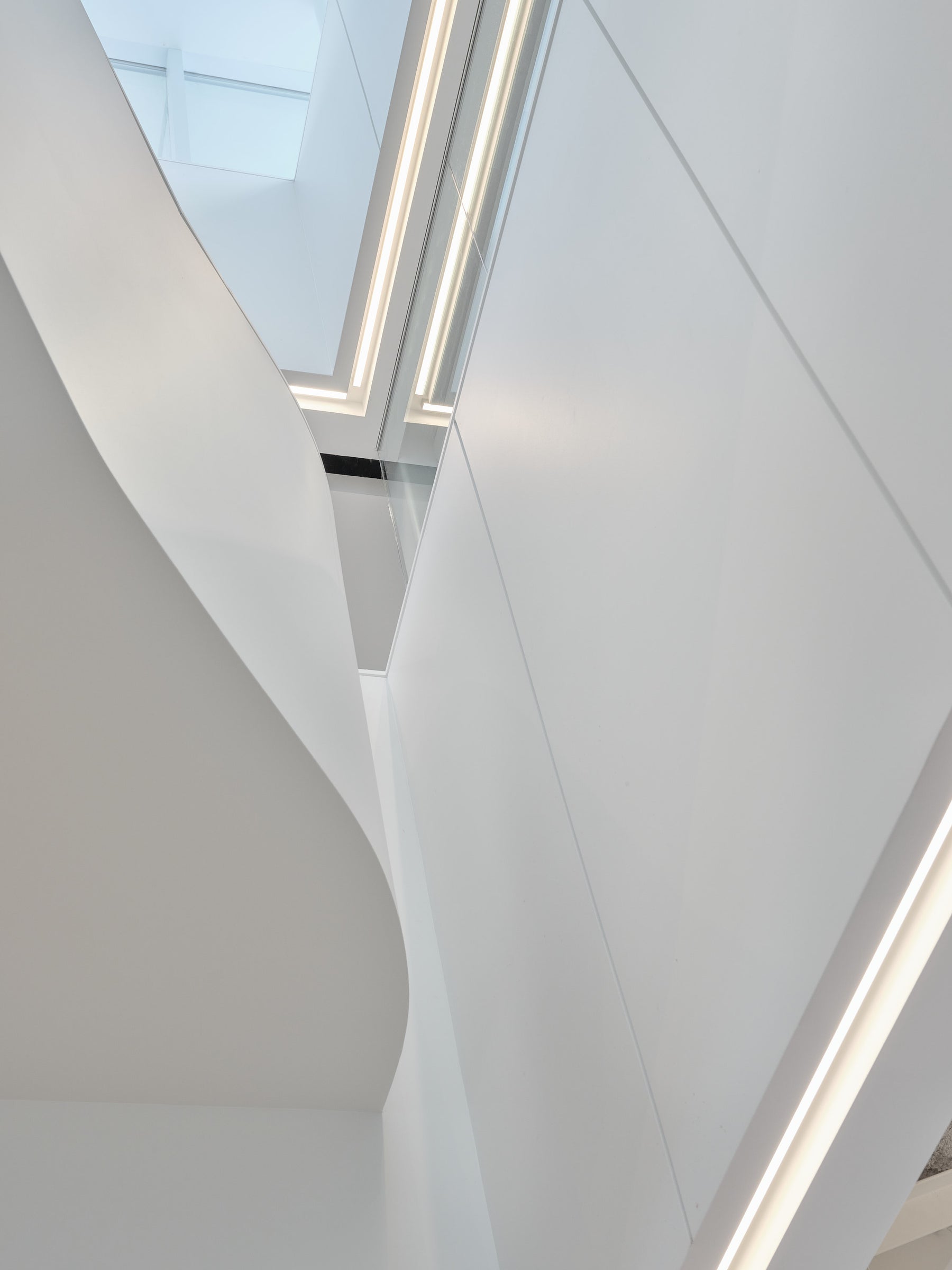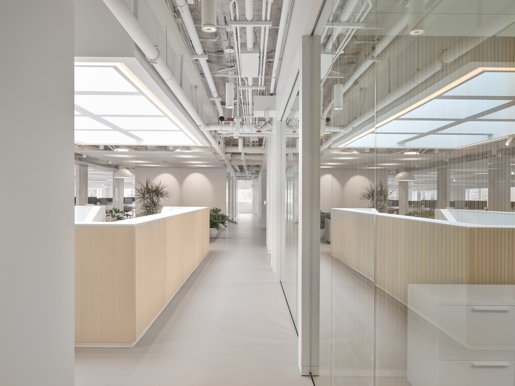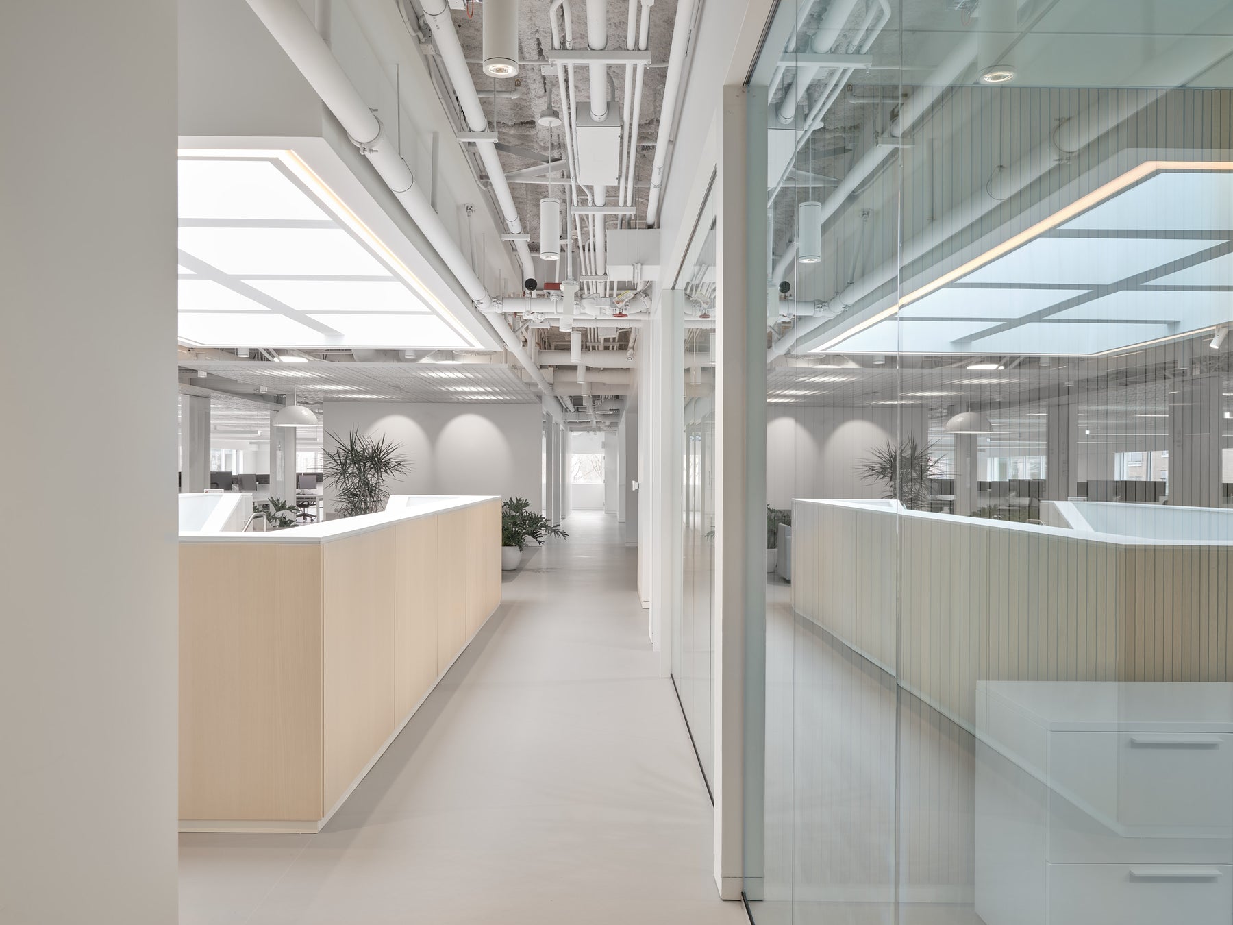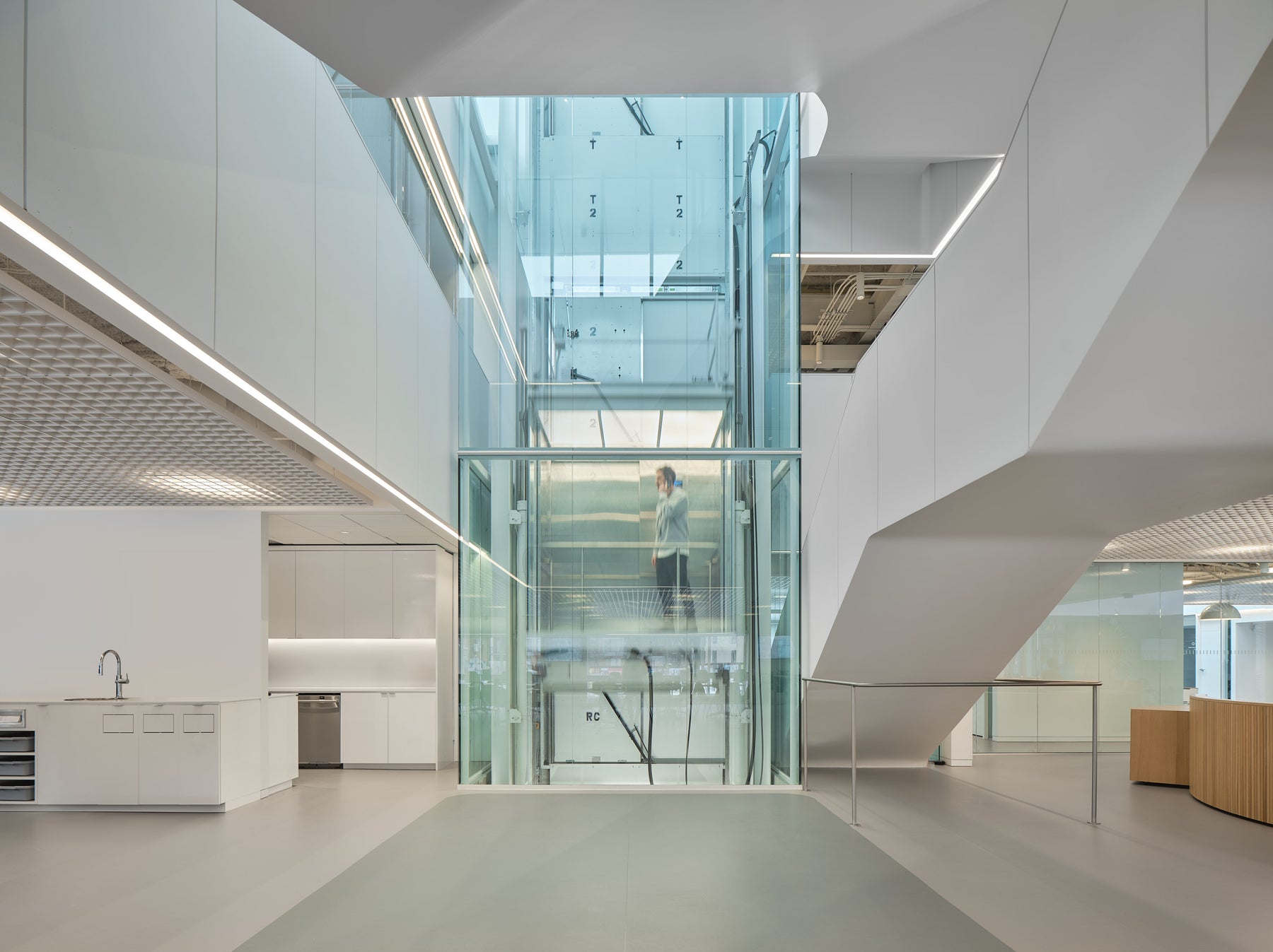 Ce revêtement, encore peu exploité en milieu de bureau, a permis de créer des surfaces claires, chaleureuses et continues. L’installation a demandé une maîtrise technique exceptionnelle : joints soudés sur toute la superficie, marches en marmoléum et en caoutchouc, précision millimétrée à chaque étape. Une intervention signée par une équipe experte, habituée aux défis de finition haut de gamme.